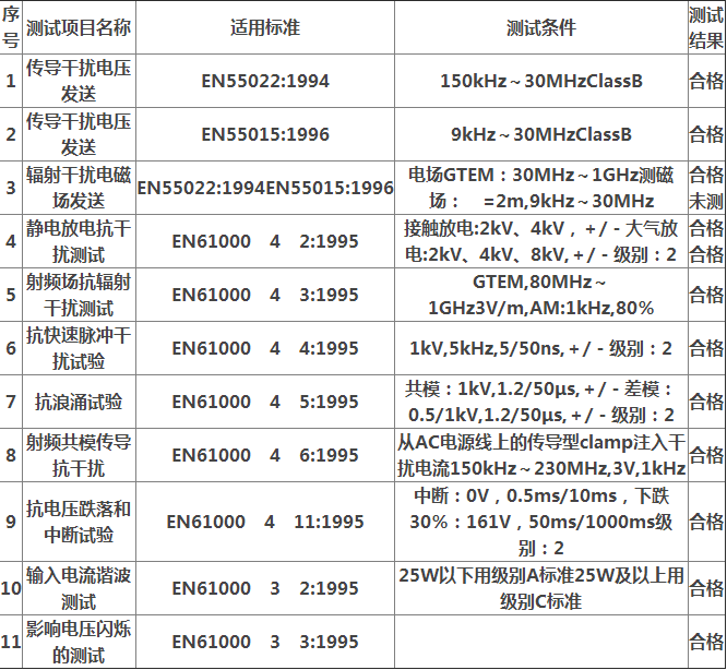 表1列出了熒光燈電子鎮流器為取得歐共體的CE/EMC認證一切必要經過的測驗項目。