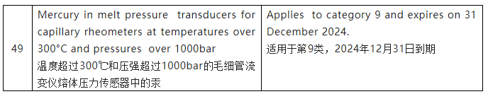 所使用的壓力傳感器,包含在毛細管流變儀中,由電氣元件組成,是指令2011/65/EU范圍內(nèi)的電氣測量設(shè)備。申請豁免中描述的毛細管流變儀屬于指令2011/65/EU附件I的第9類“監(jiān)測和控制儀器”。對豁免申請的評估包括一項技術(shù)和科學(xué)評估研究,得出的結(jié)論是,在溫度超過300℃和壓力超過1000 bar的情況下,用熔體壓力傳感器中的汞取代毛細管流變儀,目前在科學(xué)和技術(shù)上是不能實現(xiàn)的。