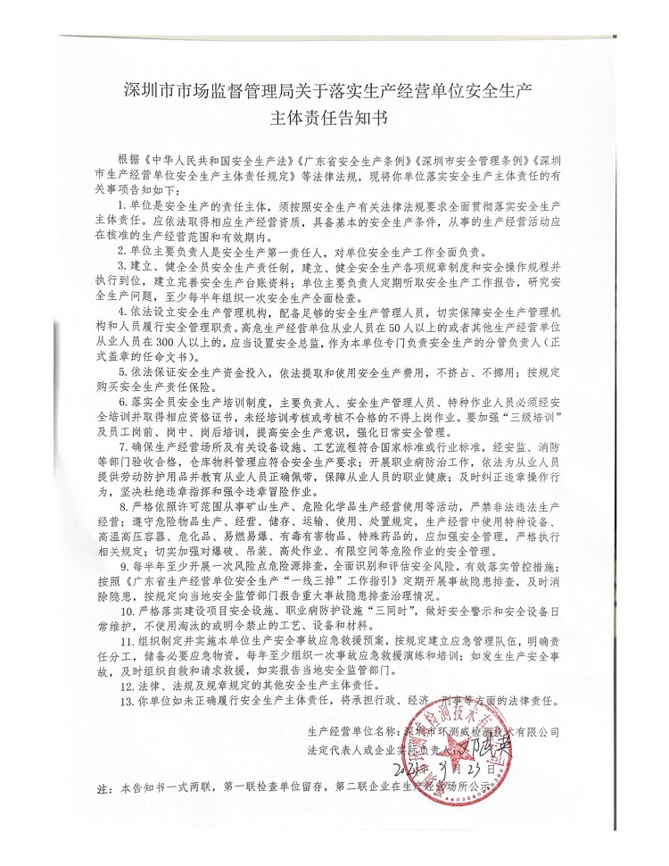 深圳市市場監督管理局關于落實生產經營單位安全生產主體責任告知書